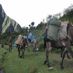 The trail follows the river through a heavily forested area with a few isolated farmhouses. It narrows and closes in and the trail winds up and down along the drainage. We pass a junction enroute, where another path leads north over the Tremo La to Tibet. Camp is in a meadow with a stone shelter. Altitude 3610 m; Distance 21 Km; Time 7 - 8 hours.